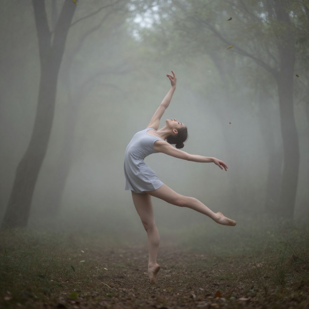 Photograph of a woman in a white dress, mid-dance in a misty forest, arms and legs gracefully extended, barefoot on a dirt