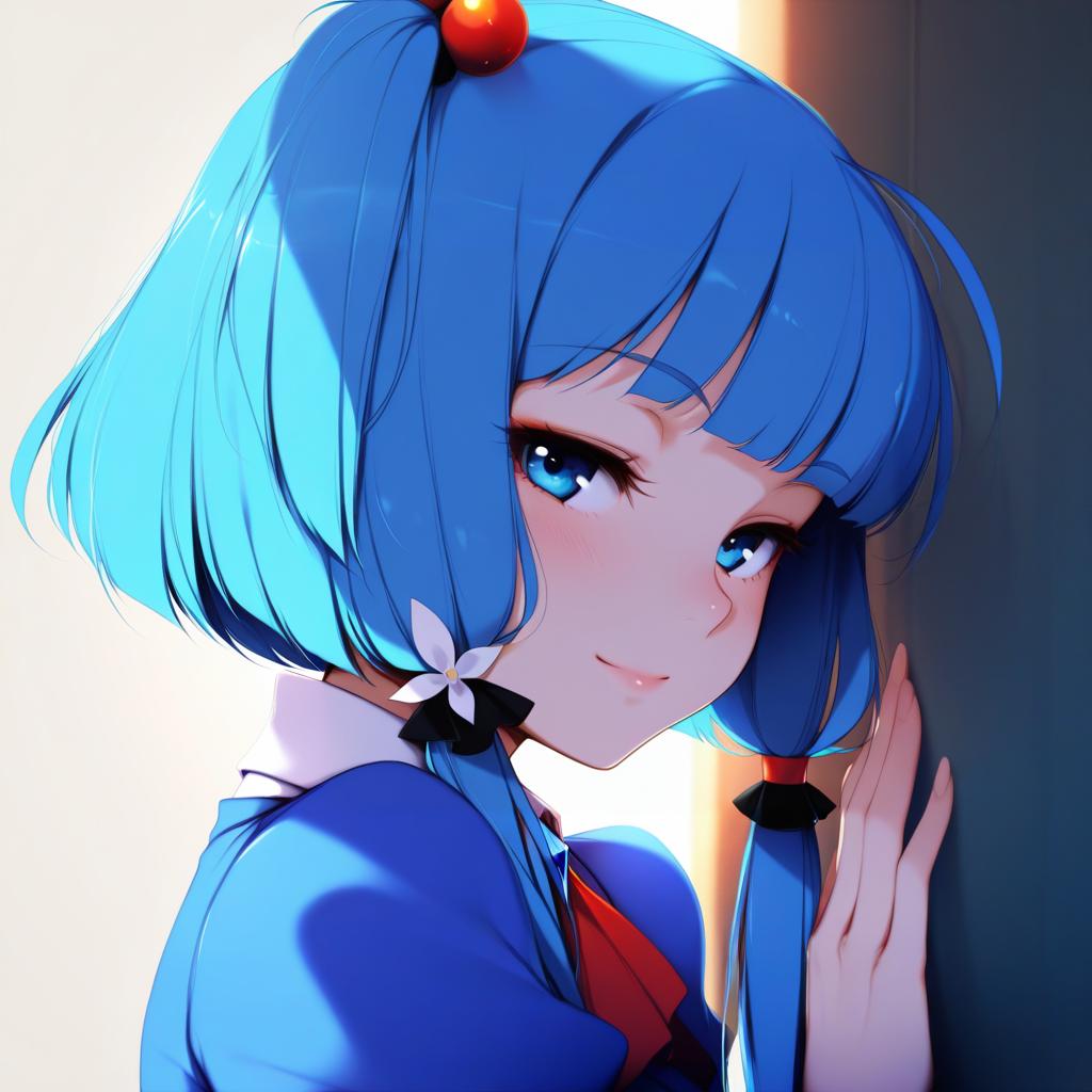 Digital illustration of a young anime girl with short bright blue hair styled with hair bobbles and adorned with a white flower. She has striking blue eyes and a gentle smile, wearing a blue outfit with a red tie. The image features soft lighting highlighting her face, creating a serene and detailed portrait in the style of the artist obj shep.