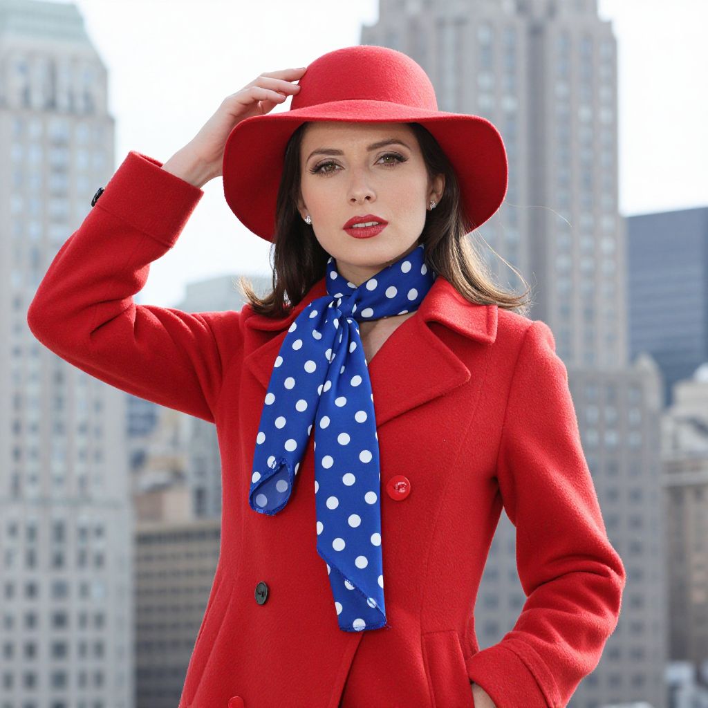 A confident woman dressed in a vibrant red Carmen Sandiego costume poses dramatically from a low-angle perspective against a cityscape backdrop. Her outfit features a wide-brimmed red hat, matching red coat, and teal scarf, capturing the iconic style of the beloved fictional globe-trotting character.