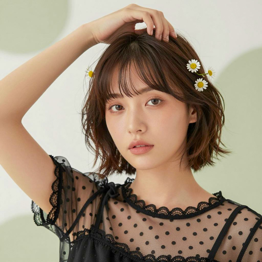 Japanese woman with short brown hair, wearing denim overalls over a white tank top, leaning against a concrete wall. She is licking a white popsicle. Her right arm is slightly bent, and her left arm is against the wall. She is standing on a street with a tree and white car in the background. She has a calm expression. The "COS JAPAN" is in the background.