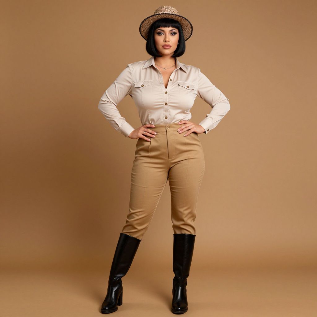 A sexy woman with big tits stands confidently, wearing a tan outfit featuring a beige shirt with a collar and buttons on the front, paired with khaki pants. She wears a stylish hat and a pair of sleek black boots. Her bob haircut is neat and bold, and she stands with her hands on her hips, exuding charm and strength. The scene is vibrant and inviting, highlighting her elegant yet bold presence.