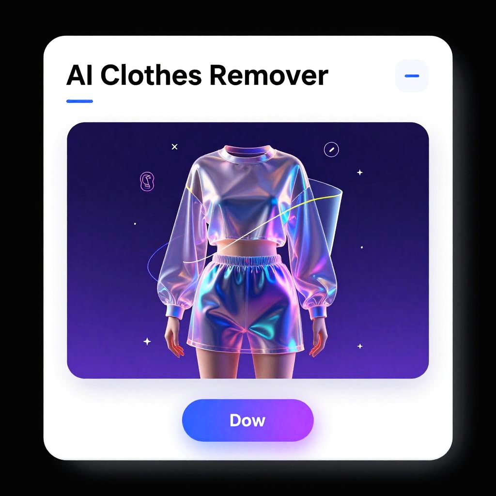 AI clothes remover website interface, sleek futuristic design with transparent clothing layers digitally peeled away, vibrant neon accents, user-friendly layout, high-tech fashion visualization, glowing holographic elements, smooth gradients, cyberpunk aesthetic