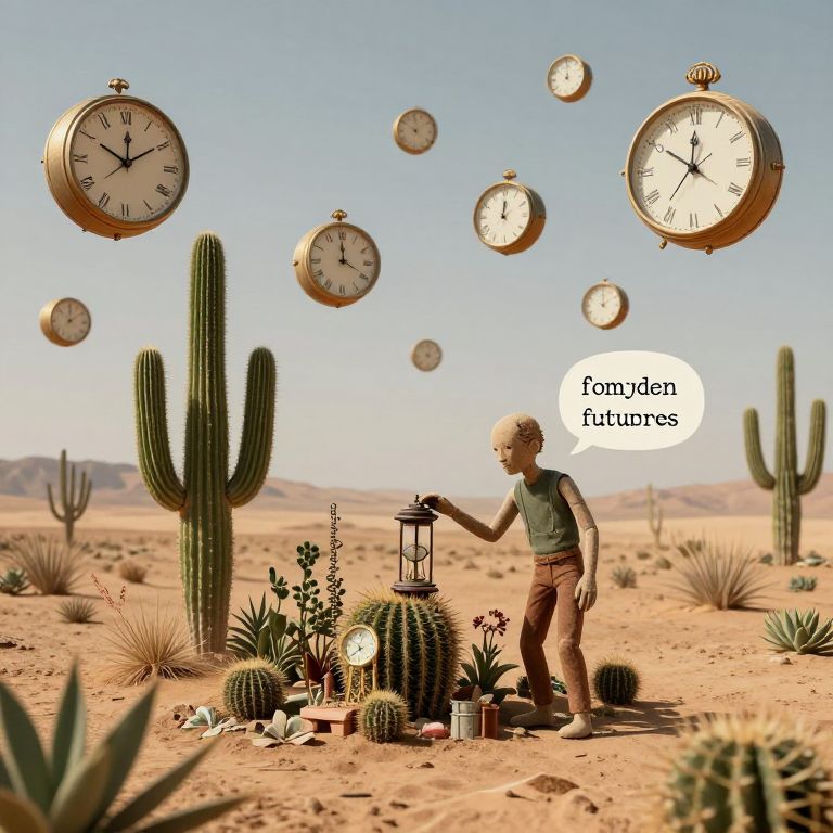 A desert of floating clocks endlessly tick backward, while a humanoid cactus tends to a garden of wilting timepieces, whispering forgotten futures.