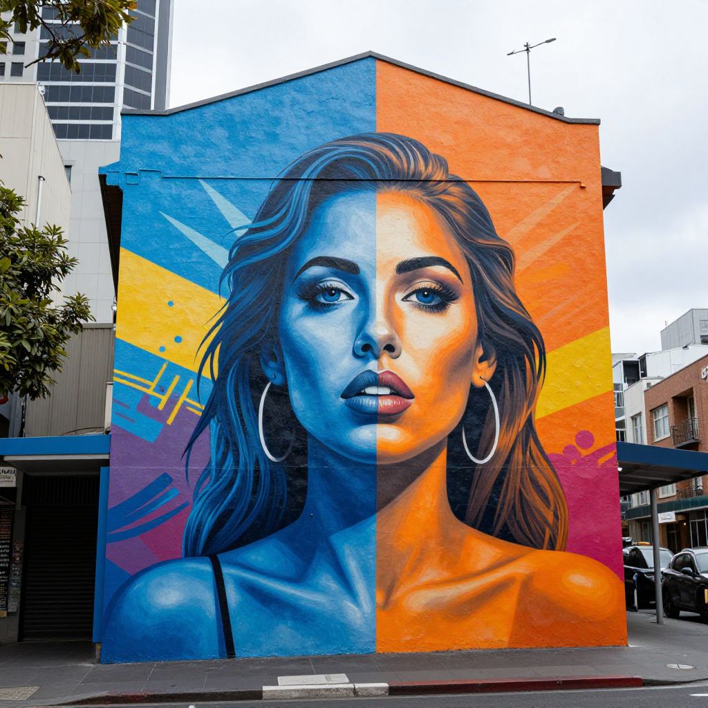 Vibrant street mural of a striking woman with blue and orange split face, hoop earrings, and intense gaze, set against a colorful urban backdrop.