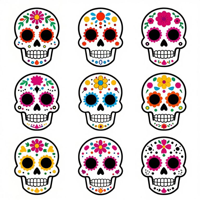 Punk-inspired sugar skull designs for Day of the Dead party decor, featuring vibrant floral patterns and bold colors arranged in a grid layout, available as a printable kit in PNG and SVG formats by CbSvyle.