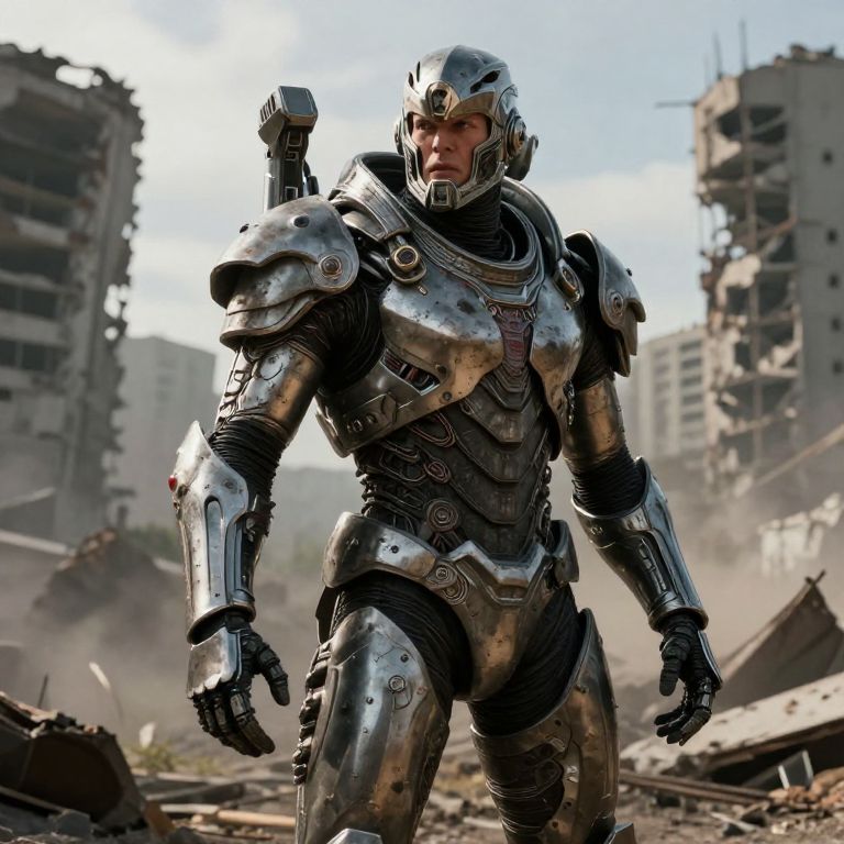 Symbiot warrior in a post-apocalyptic wasteland, armored with living metal symbiotic suit, rugged environment with remnants of destroyed cities, intense expression, dramatic lighting, gritty realistic style.