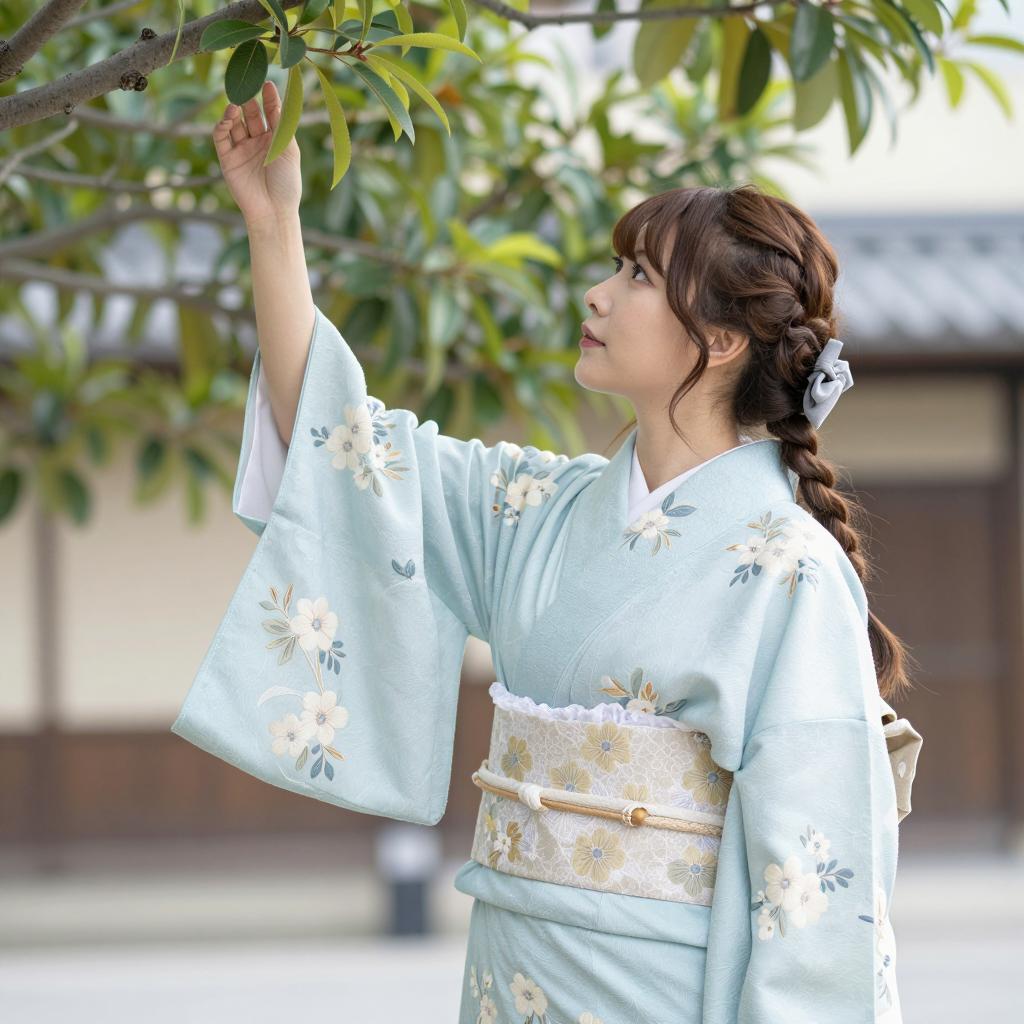 Woman in blue kimono with white lace collar and floral patterns, standing in front of a wooden window. She has purple and blue curly hair with a flower accessory, holding a black lace item in her right hand. Her left hand rests on the window frame. Her eyes are closed with a slight smile. Japanese in white on the left side. The background is a red wall with vertical wooden slats.