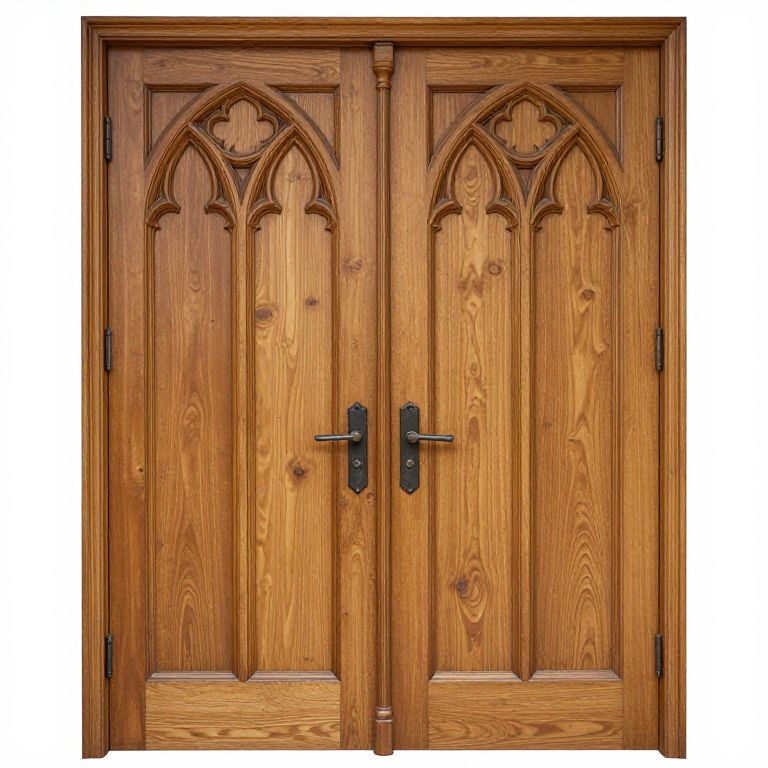 Photograph of a pair of ornate, wooden double doors with a rich, warm brown hue. The doors feature intricate, Gothic-style arches at the top of each panel, adding a decorative touch. The wood grain is prominent, showcasing natural patterns and textures. Both doors are equipped with black, wrought iron handles and hinges, providing a stark contrast to the wooden surface. The doors are centered in the image, with a plain white background that highlights the detailed craftsmanship and elegant design. The overall style is traditional and sophisticated, evoking a sense of historical architecture.