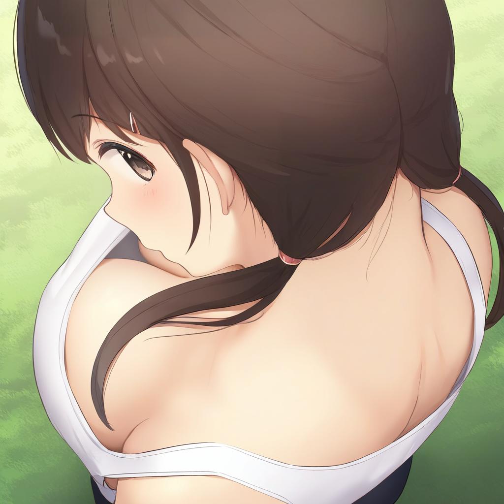 Digital illustration of an anime-style young woman with brown hair in a ponytail, secured with blue hairclips. She wears a white tank top showing cleavage, with a focus on her upper body from behind and slightly above. The setting suggests an outdoor park environment with soft sunlight and shaded areas.