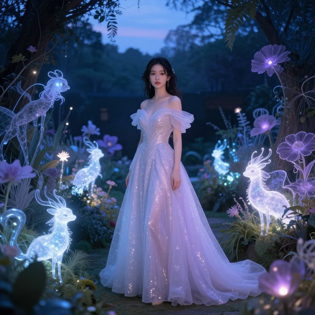 Photograph of a fair-skinned woman with dark, wavy hair wearing an off-shoulder, floor-length, white, sequined gown with a flowing, tulle skirt. She stands in a twilight garden illuminated by glowing, ethereal blue and purple butterflies and flowers, creating a magical ambiance. The background is a dark, blurred forest, contrasting with the bright, luminescent decorations. The woman's serene expression and the intricate, fairy-tale-like dress enhance the enchanting, otherworldly scene.