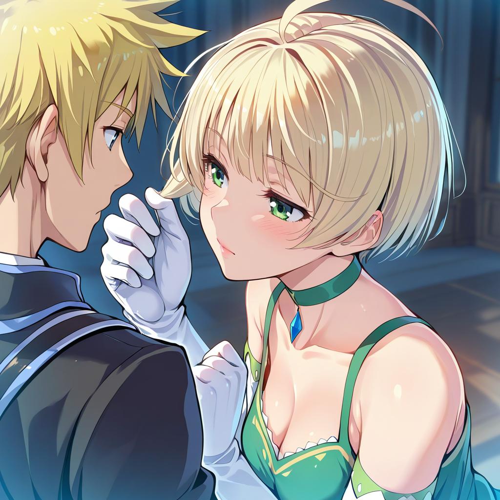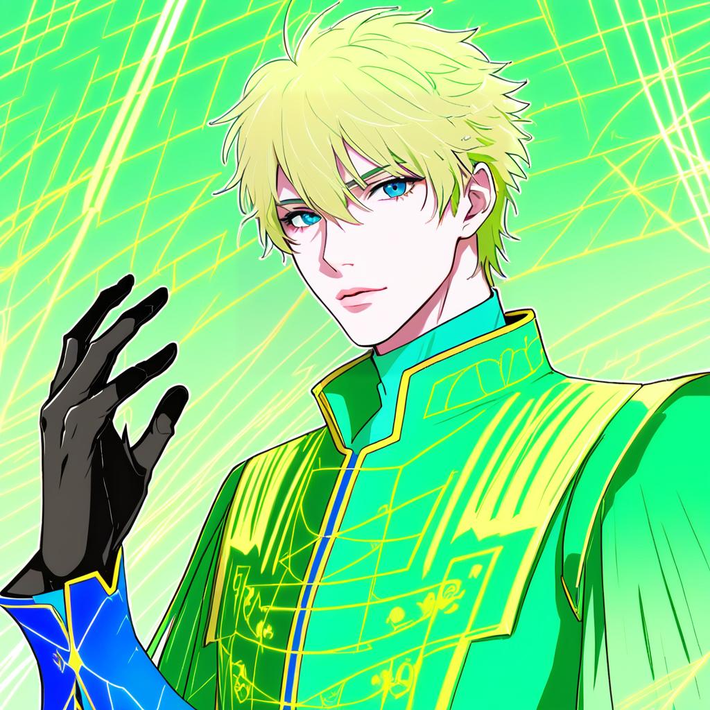 Guy cecil, tales of (series), 1boy, blue eyes, green eyes, blonde hair, short hair, gloves, green choker, by artist gyozanuko, illustrious