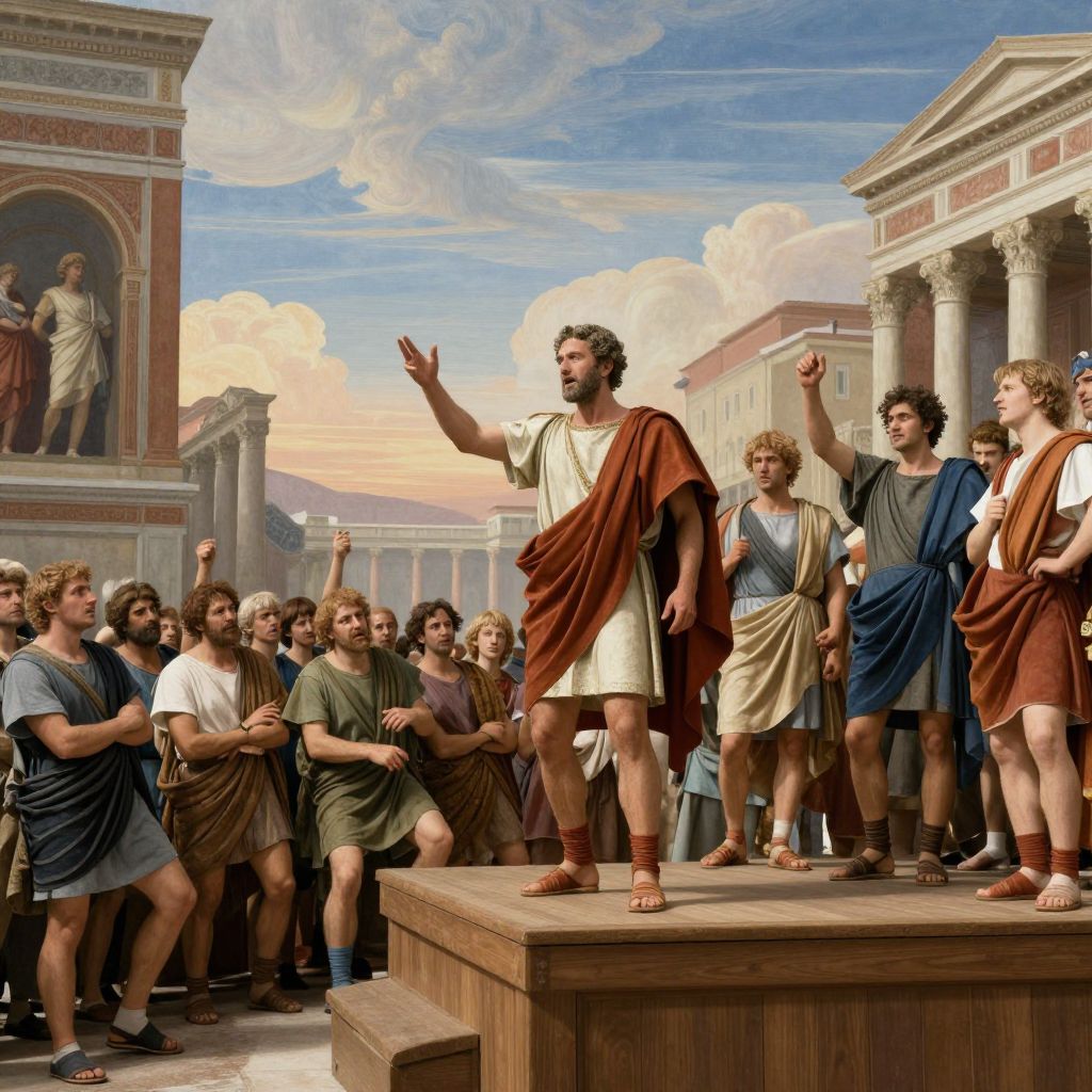 Pontius standing on a wooden platform delivering a speech to a mixed crowd in a Roman forum, lively expressions on the faces of the audience, open sky above with soft clouds, elements inspired by classical fresco paintings and dramatic storytelling.