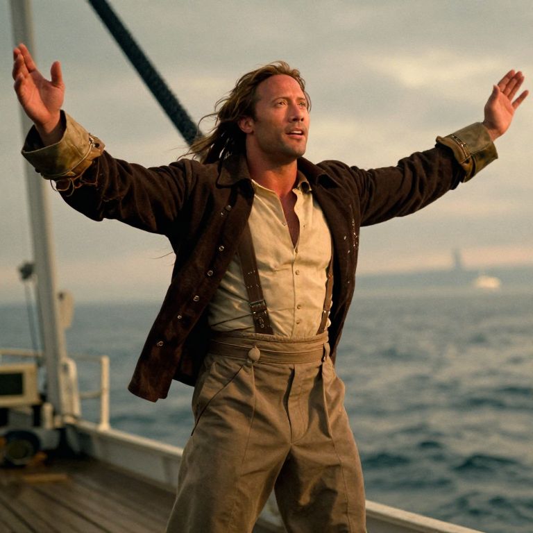 Film still of dwayne johnson as jack dawson wearing a dark brown jacket and light brown pants and putting arms in air in king of the world scene in titanic 1997