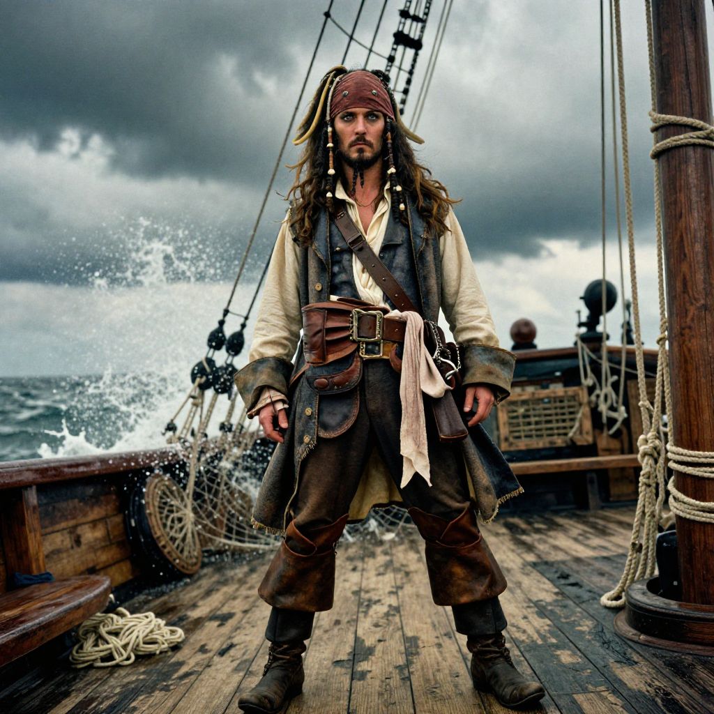 Photograph of a long-haired man with open arms, wearing a black jacket, beige shirt, and brown pants, standing on a ship deck at sunset