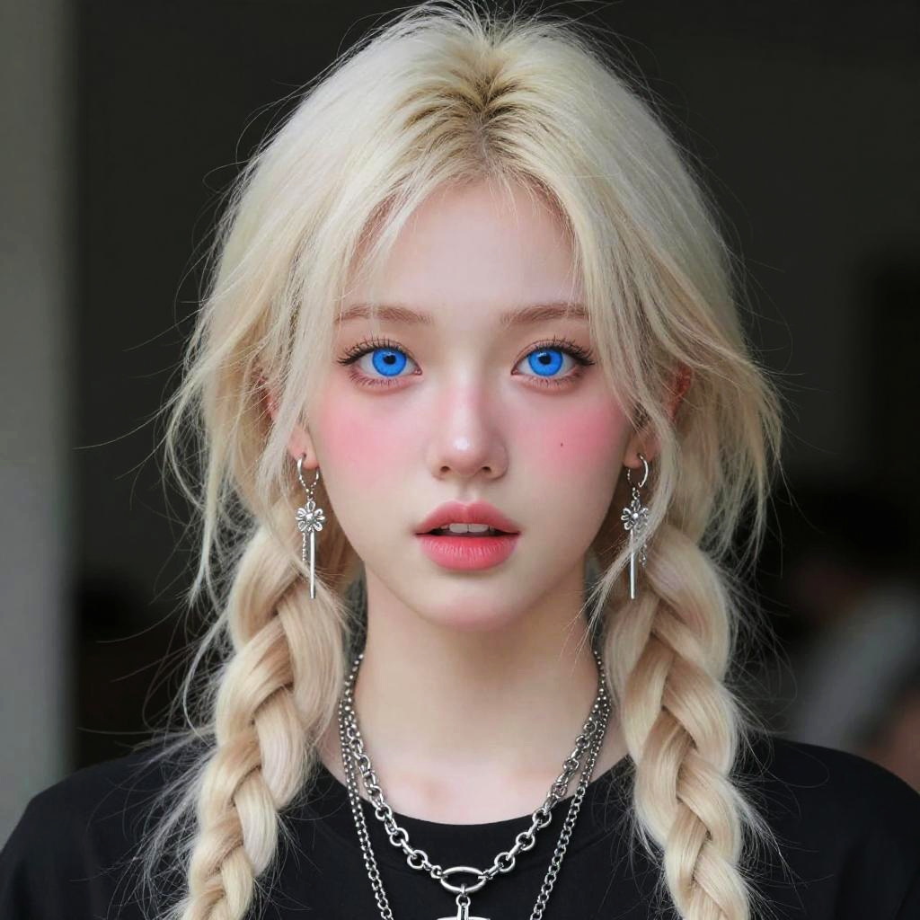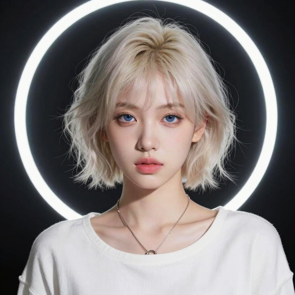 Digital art portrait of a fair-skinned woman with wavy, white-blue hair that blends into soft, cloud-like textures. Her dark pink lips and intense purple eyes stand out against the luminous, pastel sky background. She's framed by a circular glow, giving a dreamy, ethereal vibe. The overall style is hyper-realistic with a fantasy twist, emphasizing vibrant colors and smooth, glossy textures.