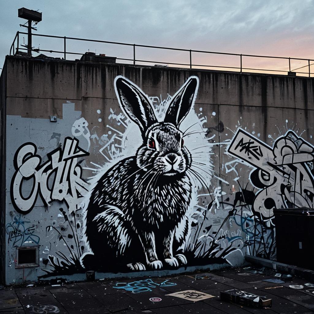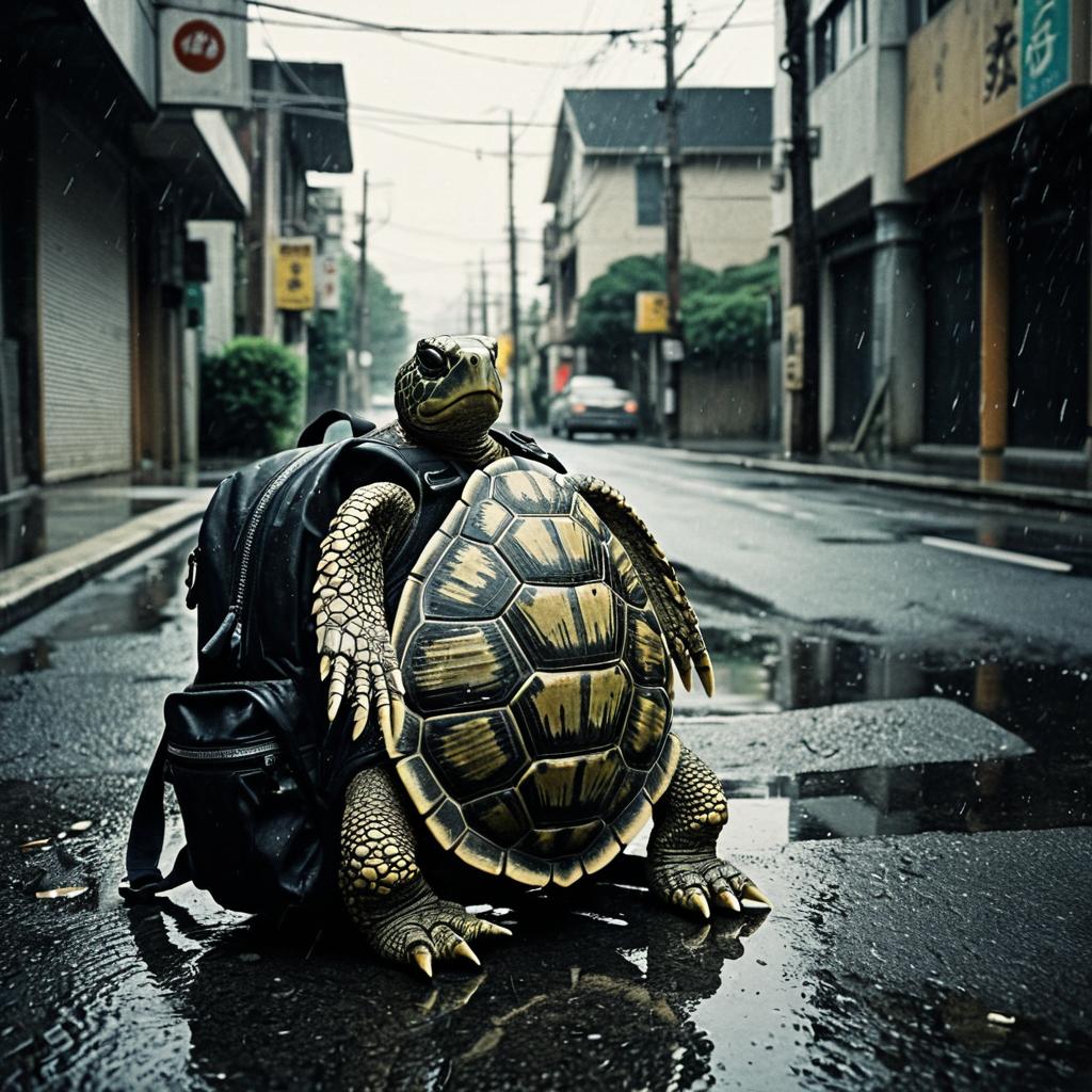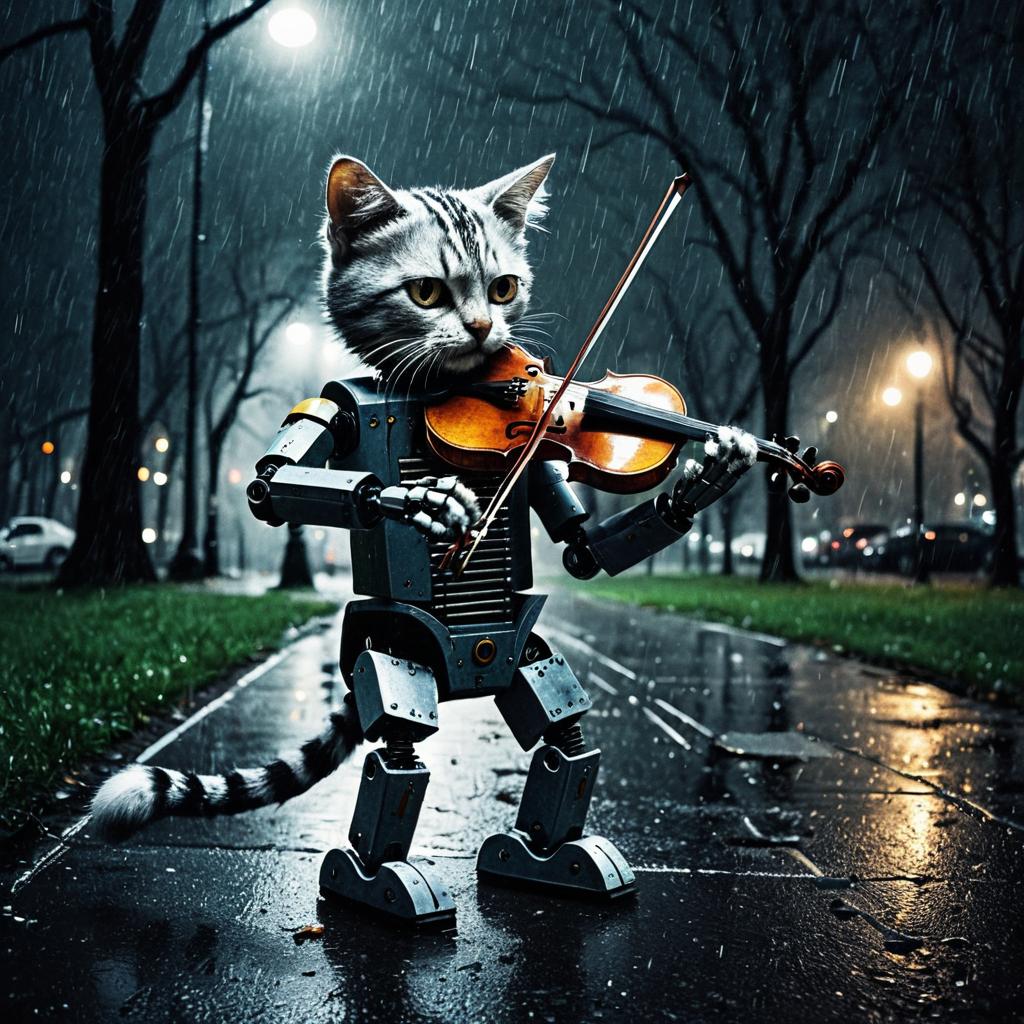 Lowbrow art of a robot cat playing violin, influenced by Otto Schade, in a moody, rainy, city park at night, gritty textures, dramatic lighting, urban and melancholic