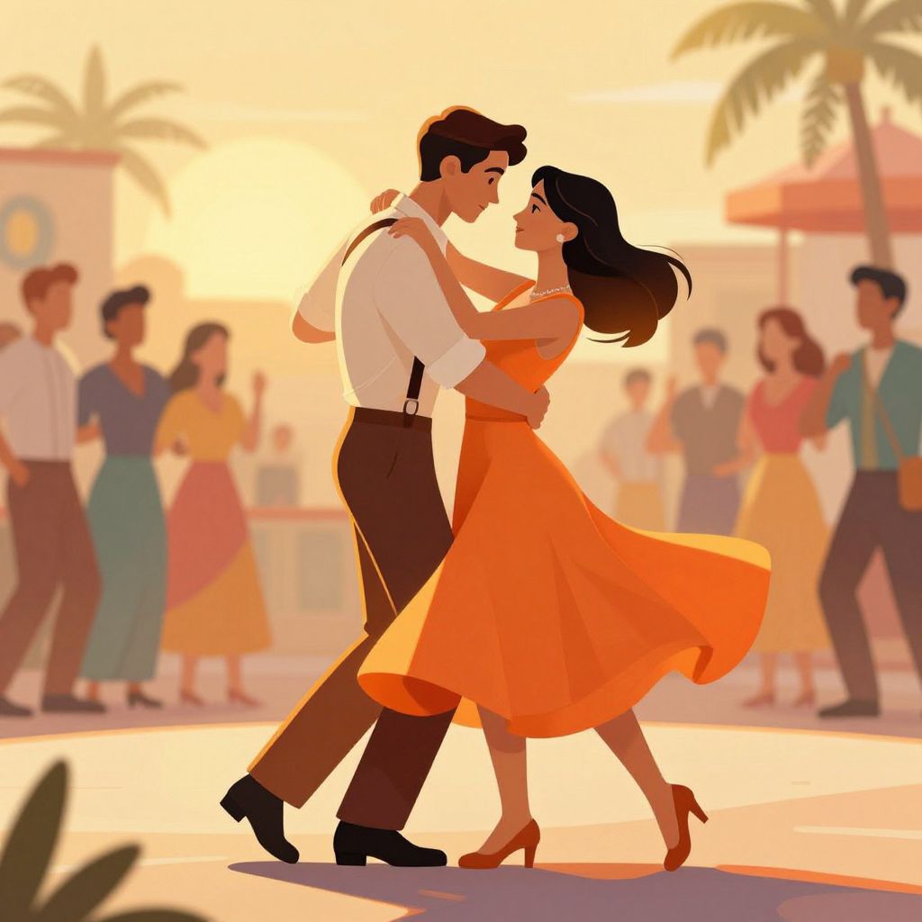 A vibrant digital illustration captures a couple dancing gracefully under golden-hour lighting, with the man in a classic white shirt and suspenders leading the woman in a flowing orange dress, surrounded by an animated crowd in a retro-inspired setting.