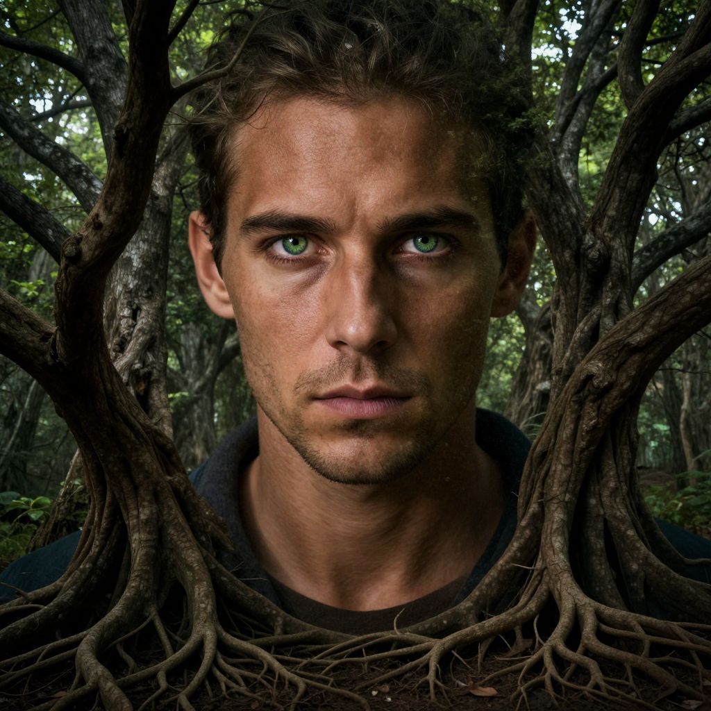 Photograph of a serious-looking, Caucasian man with short brown hair and green eyes, framed by intricate tree roots in a dense forest. He wears a dark, slightly textured shirt. The background is a lush, green forest with sunlight filtering through the leaves. The tree roots, dark brown and textured, wrap around his head and shoulders, creating a natural frame. The man's skin is slightly tanned, and he has a slight stubble. The overall image has a high contrast, highlighting the man's face and the detailed texture of the roots.