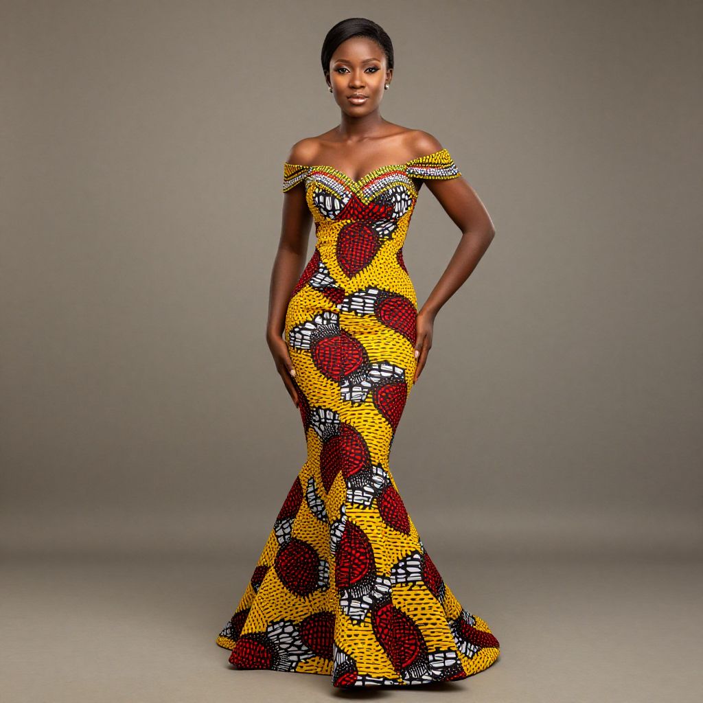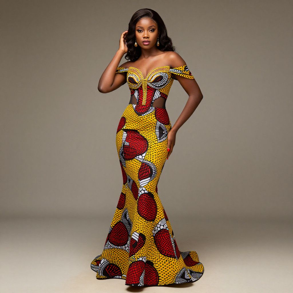 Photograph of a beautiful Black woman with dark skin, wearing a vibrant, off-shoulder, yellow and red patterned, form-fitting gown