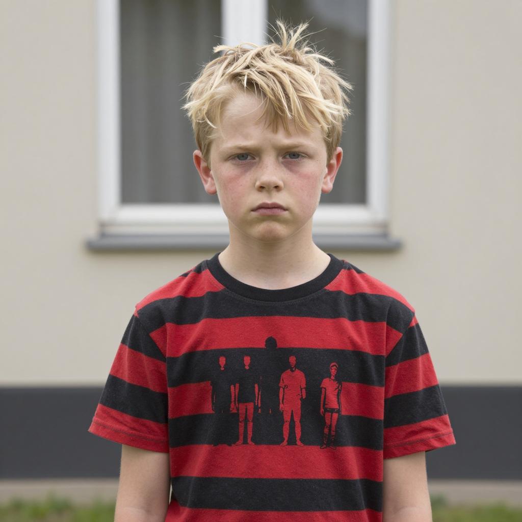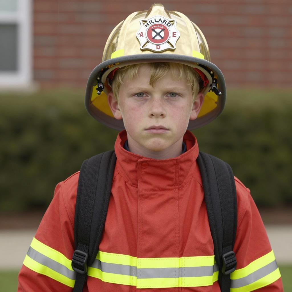 Youth fireman costume, photorealistic, young boy, firefighter uniform, red jacket with yellow stripes, black backpack, shiny gold helmet with "HILLARD FIRE DEPARTMENT" emblem, serious expression, green eyes, fair skin, short blonde hair, outdoors, blurred background with green shrubs and brick building, daytime, realistic lighting, detailed ures, high contrast, upper body shot, close-up, T2I model, hyper-realistic style