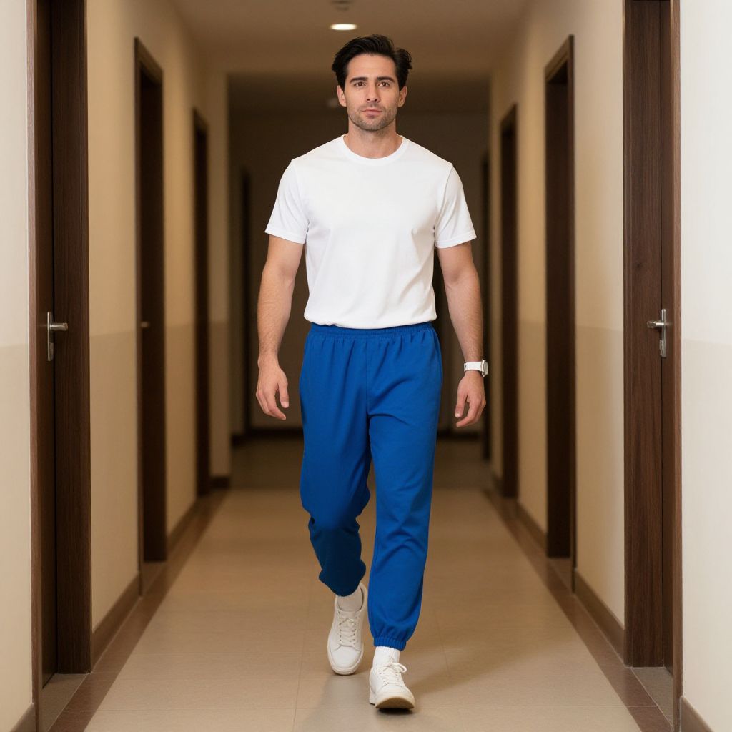 "Workout Pants Costume, man in white shirt and blue pants walking down a hallway"