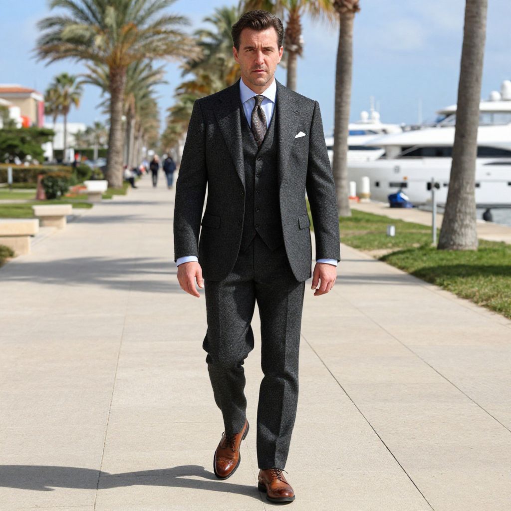 A man, charcoal gray tweed three-piece suit, light blue dress shirt, patterned silk tie, brown leather brogues, sunlit promenade, palm trees swaying, luxury yachts docked, cameraphone style, confident expression. Man has masculine face and piercing eyes