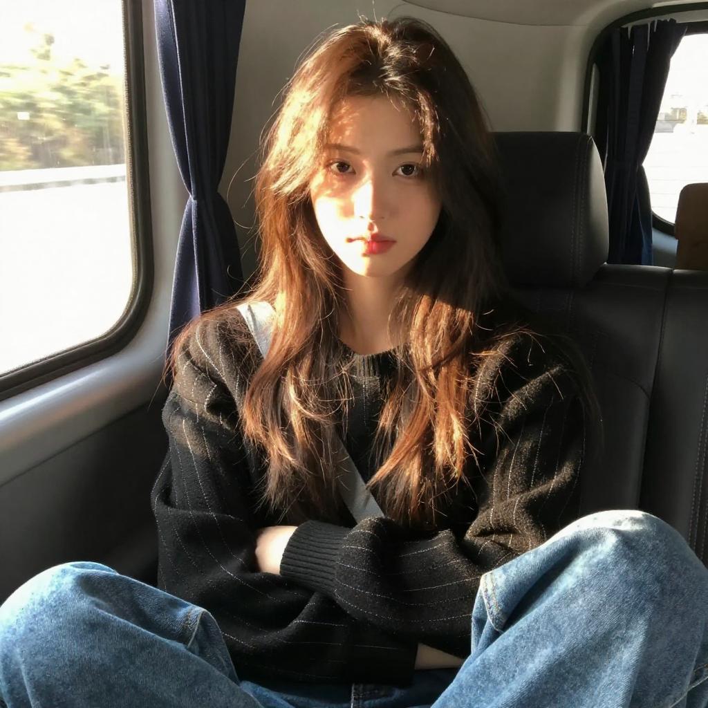 Photograph of a young woman with long, straight black hair and fair skin, wearing a brown long-sleeve top, sitting in the backseat of a taxi. She gazes slightly to the right with a neutral expression. The taxi's patterned ceiling and yellow car outside are visible through the window.