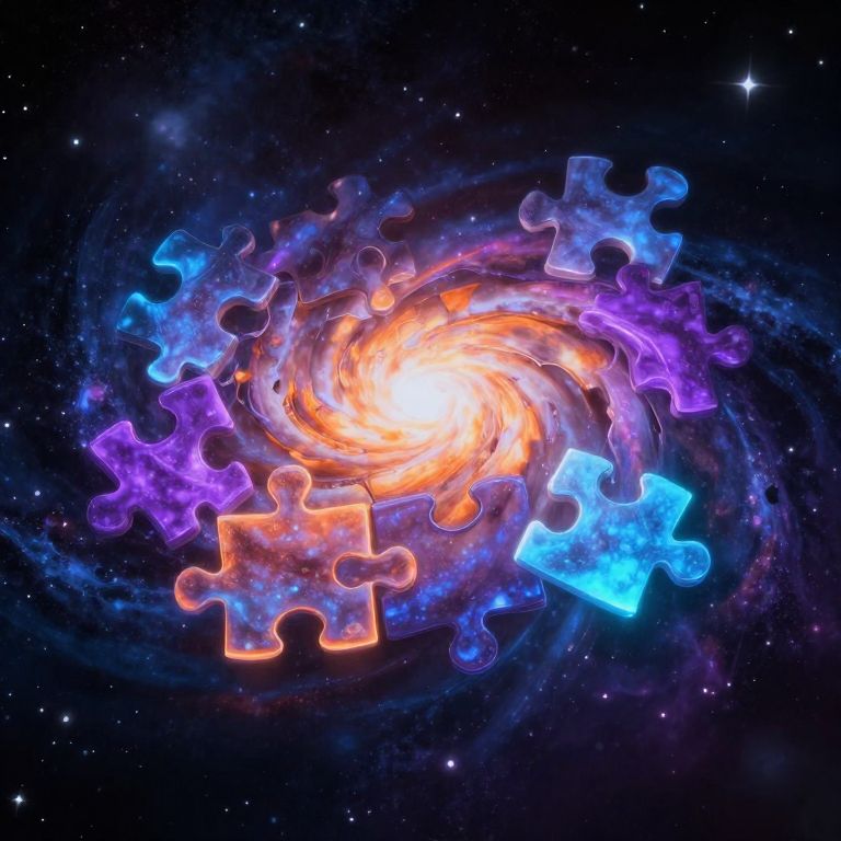 Glowing puzzle pieces float amidst a cosmic backdrop, seamlessly interlocking to form a radiant spiral galaxy while casting vibrant hues of orange, purple, and blue across the star-studded expanse.