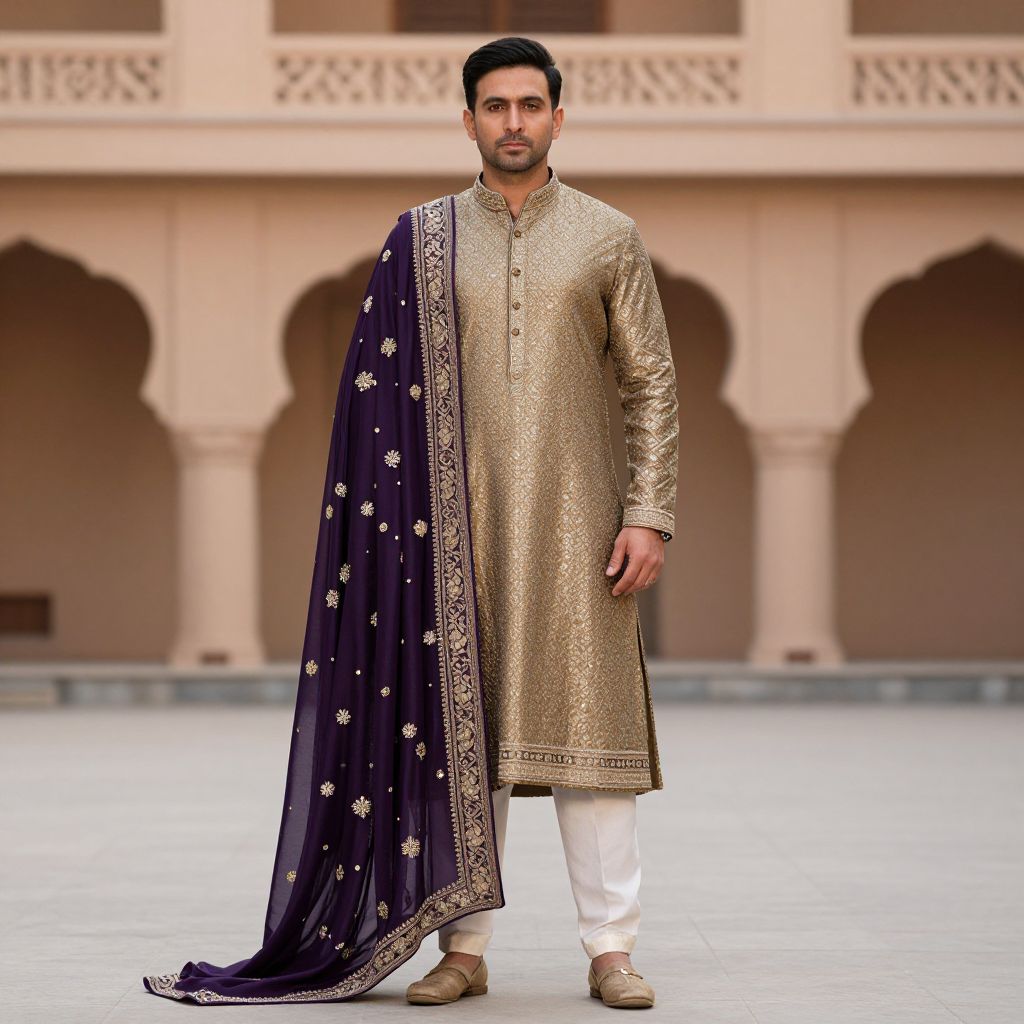 Sherwani Shawl Costume, a man in a purple and gold outfit standing in front of a building