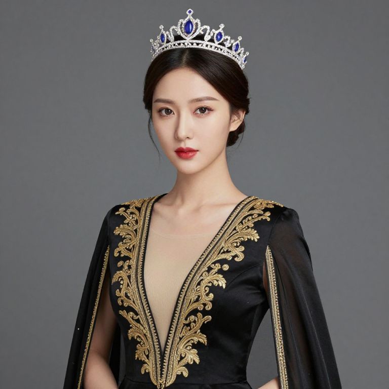 A woman with long dark hair is wearing a red and white dress with a black belt. The woman has a crown on her head and a red rose in her hair.