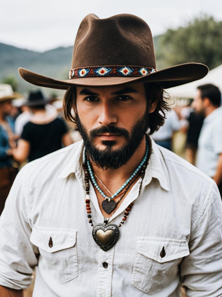 Bohemian attire party male, 1boy, male focus, facial hair, beard, hat, looking at viewer, blurry background, necklace, shirt, jewelry, cowboy hat, solo, outdoors, blurry, heart, realistic, white shirt, day, short hair, mature male