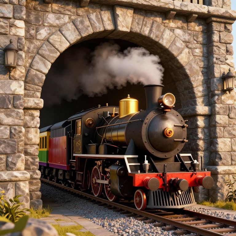 A vintage-style 3D render depicts a classic steam locomotive emerging from a stone archway, its golden-hour lighting casting warm glows on the surrounding textures, as it carries a train of colorful carriages through a tunnel, symbolizing the unrolling of connections between distant realms shaped by shared dreams.