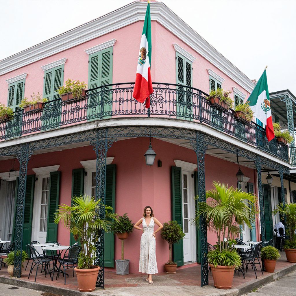 Historic French Quarter hotel with vibrant pink facade, green shutters, and intricate wrought iron balconies, featuring a woman standing gracefully on the porch under a Mexican flag, surrounded by potted plants and outdoor seating.