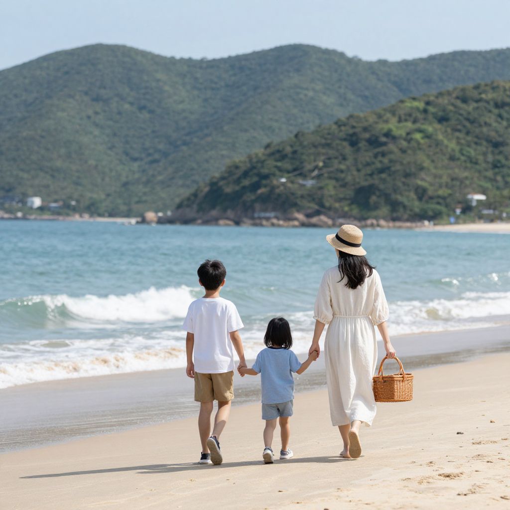 Family enjoying a sunny beach stroll, hand-in-hand along the shoreline, with a picnic basket carried by the woman as they walk towards the tranquil ocean and lush green mountains in the background.