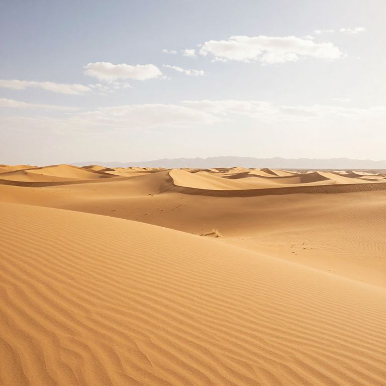 Golden desert dunes stretch endlessly, their smooth, rippling surfaces bathed in warm sunlight, while distant mountains loom faintly against a pale sky dotted with wispy clouds.