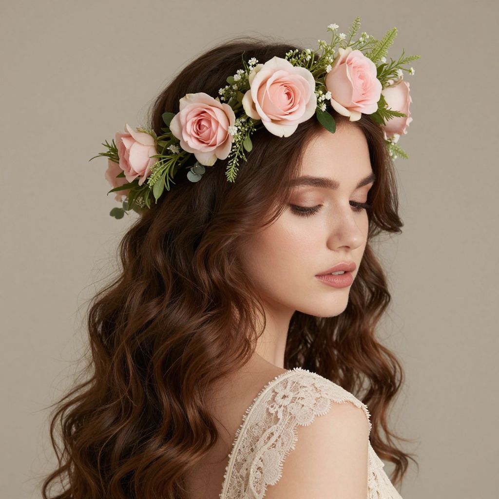 Elegant floral crown adorns a woman's head, featuring soft pink roses and delicate green foliage, complementing her lace-trimmed top and cascading waves of brown hair.
