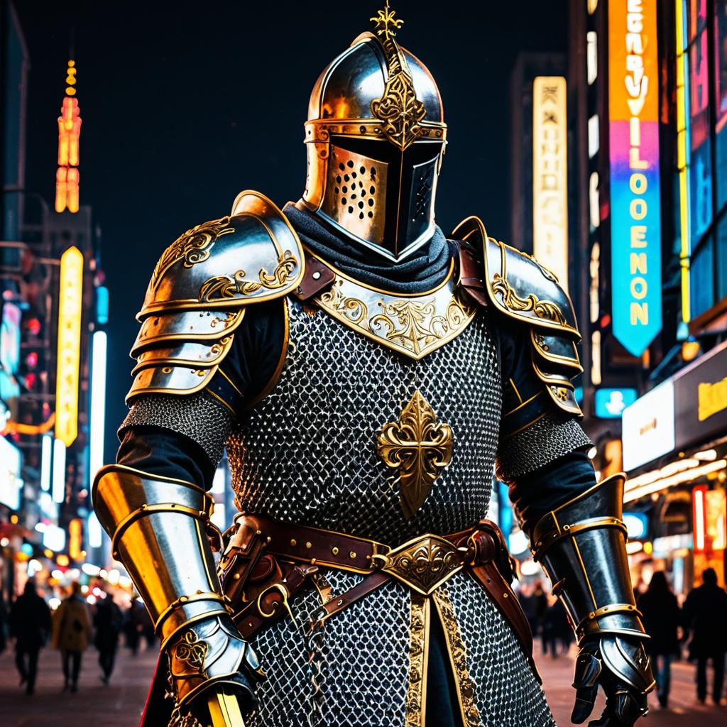 Medieval armored knight wearing shimmering chainmail and crowned helmet with intricate engravings and ornate golden sword hilt, standing under neon-lit cityscape lighting, photorealistic, ultra-detailed --sref 1420