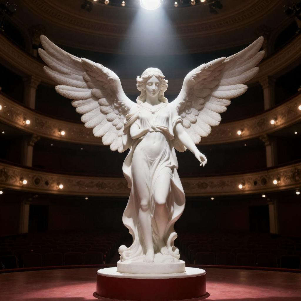 A dramatic photograph of a large, white, angelic statue with outstretched wings, illuminated by a bright spotlight from above. The statue stands on a red and white circular pedestal in a dark, crowded theater. The background features dimly lit, curved walls with small stars.