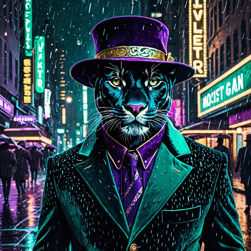 Digital illustration of a velvet-textured black panther anthropomorphized wearing a broad-brimmed purple hat with gold detailing, a deep emerald green velvet tailored jacket, and a matching purple shirt and tie. The scene is set in a vibrant, rain-soaked city street at night with glowing neon signs and wet, reflective pavement, highlighting a blend of intricate fabric patterns and a moody urban atmosphere.