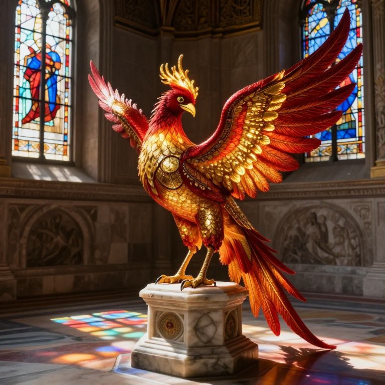 Digital artwork of a vibrant, golden and red phoenix with spread wings standing on a marble pedestal in a sunlit, stained-glass cathedral.
