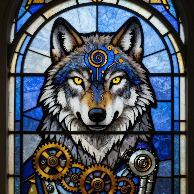 The image depicts a highly detailed stained glass window featuring a mechanical representation of a wolf. The wolf's face is adorned with intricate designs, including a blue and gold spiral pattern on its forehead, which resembles the DMT molecule. The wolf's eyes are striking, with a vibrant yellow hue that stands out against its gray fur. The window is framed with a black border, and the background consists of a blue and white geometric pattern, adding depth and contrast to the scene. The wolf's mechanical elements, such as gears and cogs, are integrated seamlessly into its body, giving it a futuristic and otherworldly appearance. The overall composition is balanced, with the wolf centrally positioned and the surrounding elements complementing its mechanical features. The interplay of colors, textures, and shapes creates a visually captivating and harmonious image.