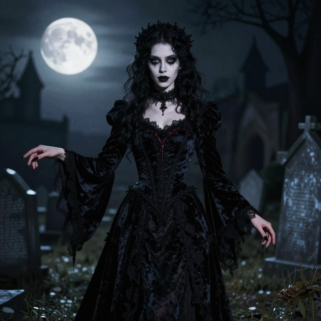 Gotica culona style gothic woman with flowing dark velvet dress, intricate lace details, dramatic makeup and piercing eyes, set against a moonlit ancient cemetery background, atmospheric and moody.