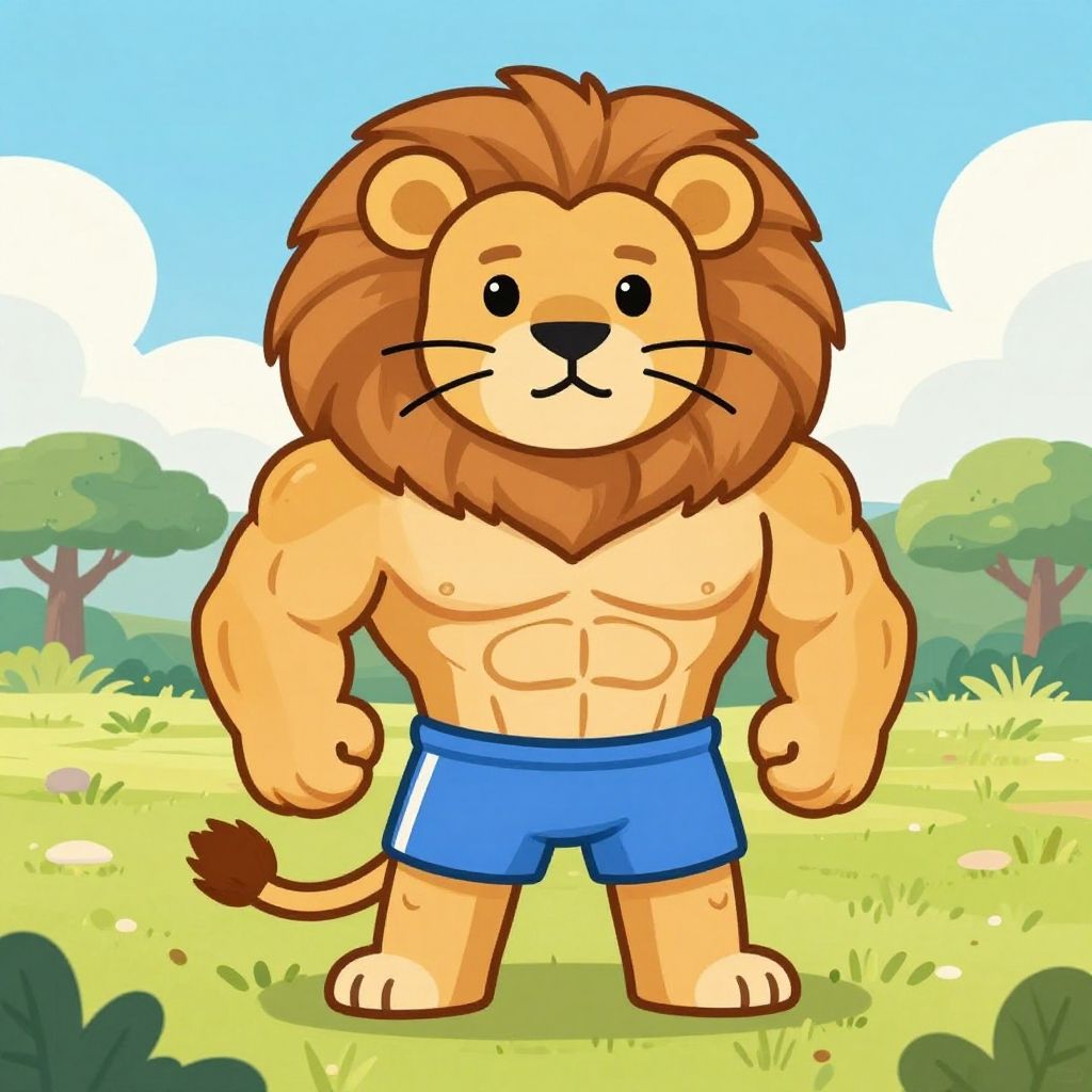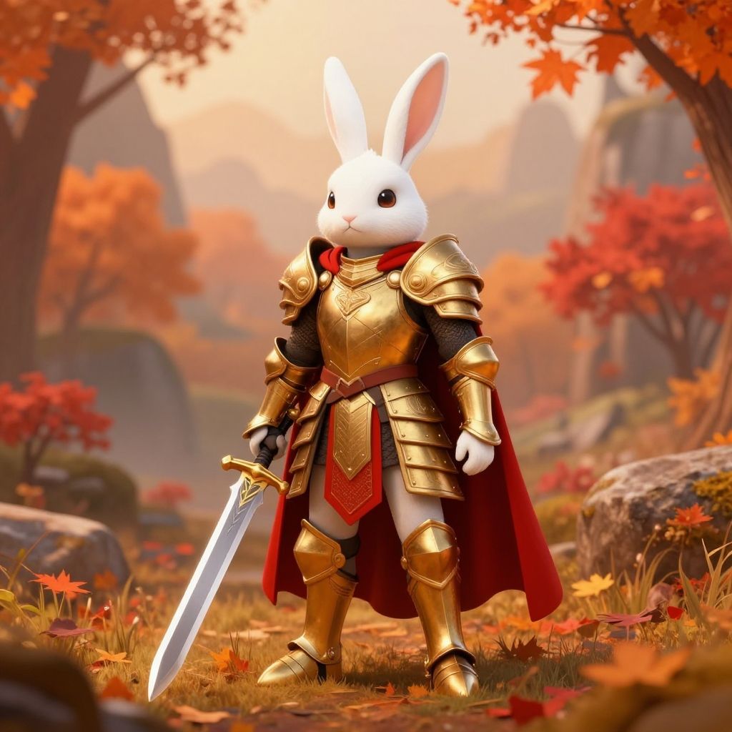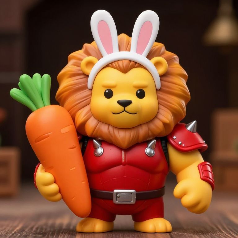 Kawaii Toys Humanoid Lion, wearingcrimson armorwith metal spikes on shoulderpads, built like a bodybuilder, wearing fake bunny ears head band and holding a giant carrot,