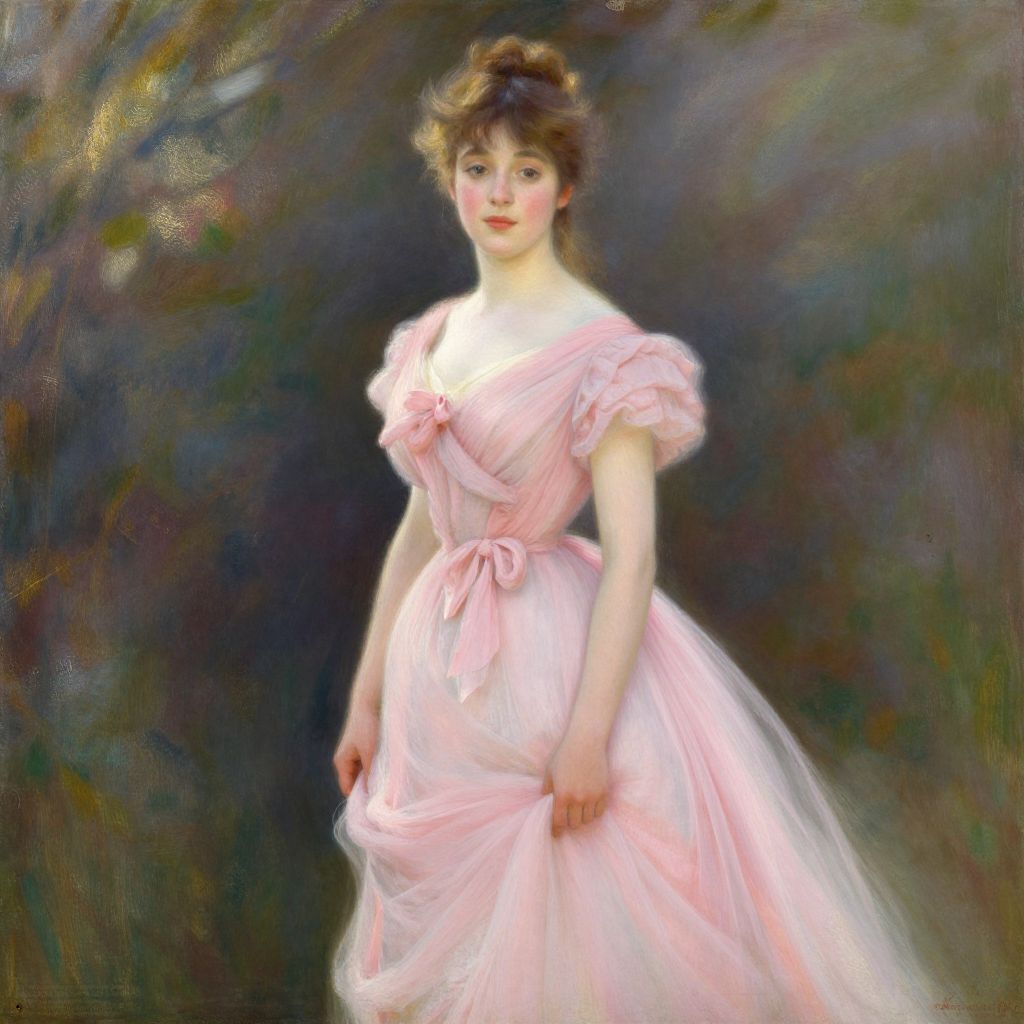 A digital reimagining of Pierre-Auguste Renoir's style, this illustration depicts a woman in a flowing pink dress, exuding a vintage charm reminiscent of early 20th-century portraiture, with soft lighting and delicate brushwork effects enhancing the timeless elegance of the scene.