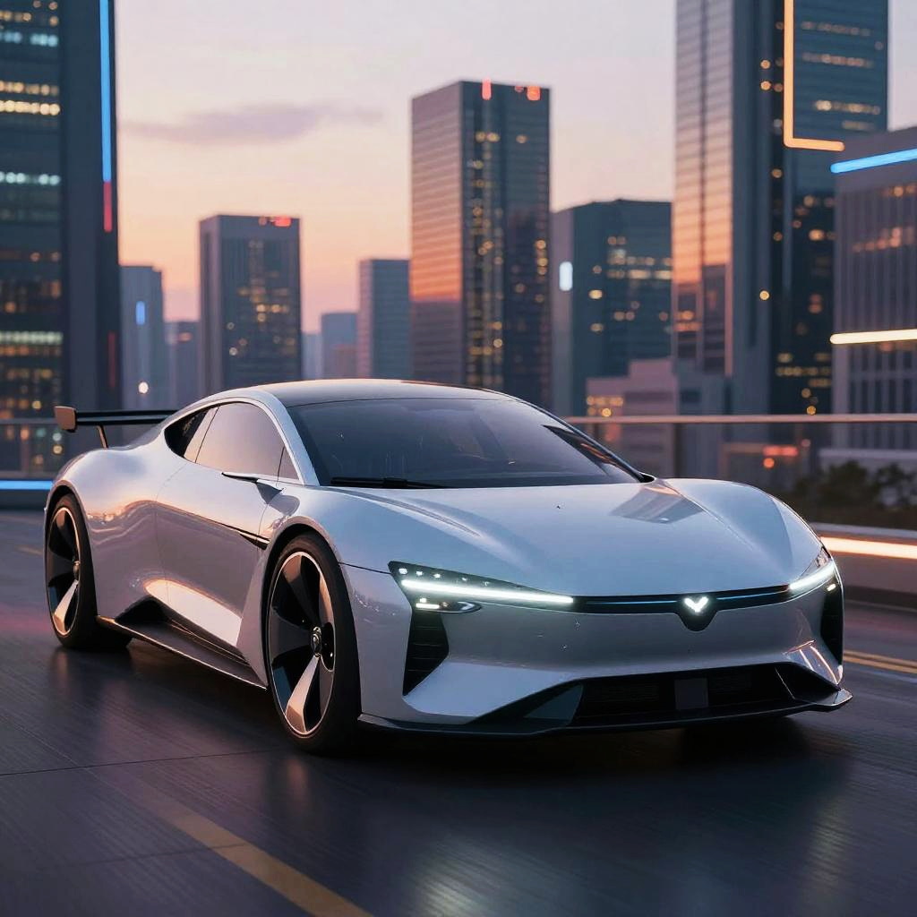 AI design car, futuristic sleek vehicle with smooth curves and glowing accents, advanced autonomous features, set in a high-tech cityscape at dusk, vibrant colors, ultra-modern aesthetic, digital art style.