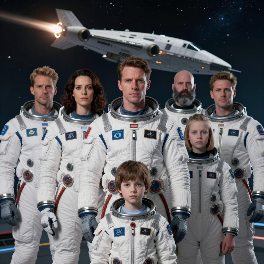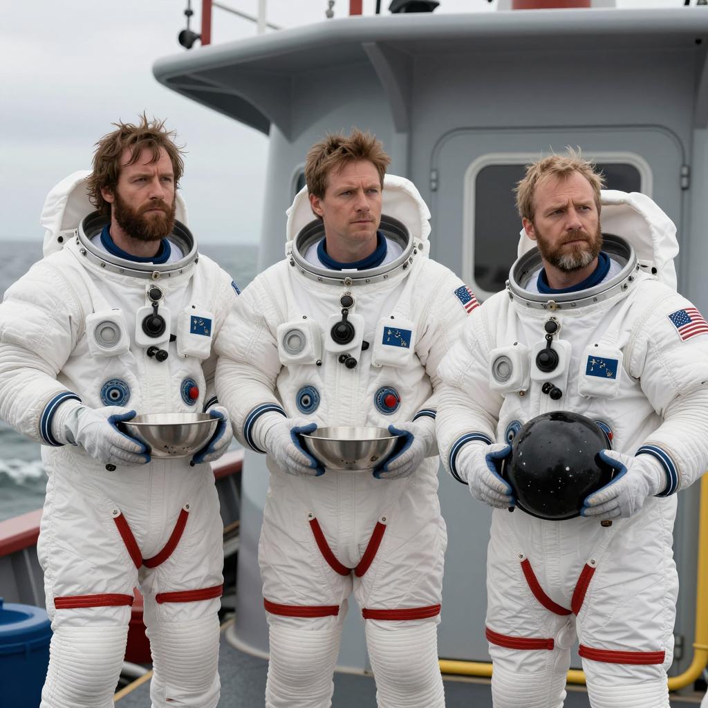Six astronauts in bright orange space suits with blue collars, walking in a group. They carry helmets and are wearing multiple patches on their suits. Background includes American flags. Five men and one blonde woman. Metal barricades in foreground. One man in a blue suit is partially visible on the left. Astronauts have serious expressions.