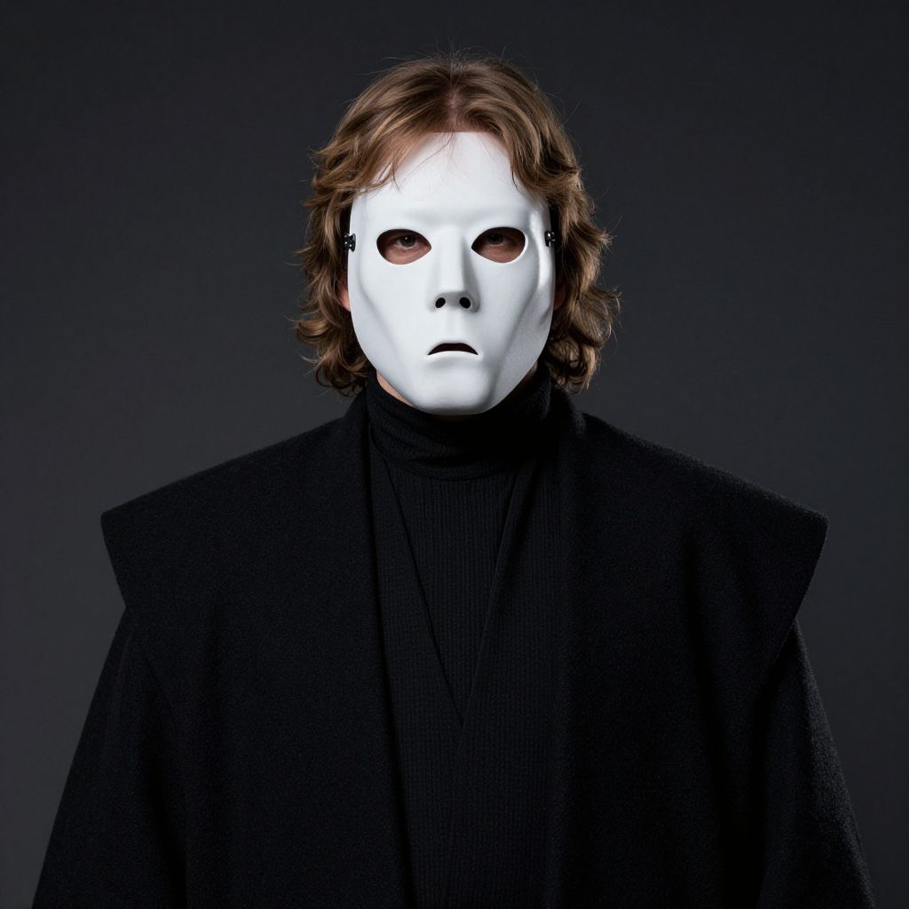 Photograph of a person with white mask, brown wavy hair, black high-collared coat, and dark background, exuding a mysterious,