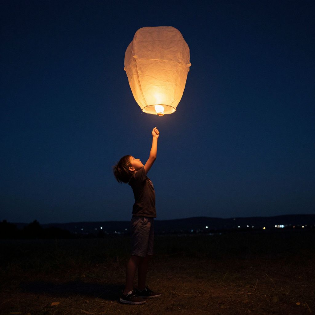 Photograph of a child with light brown hair, wearing a dark T-shirt and gray shorts, standing in a dark field at night, releasing a glowing orange paper lantern into a deep blue sky. The child's face is illuminated by the lantern's light, and they are looking upwards with their right arm raised. The background is a dark silhouette of distant hills with small, scattered lights. The ground is dark and textured, with the lantern creating a soft, warm glow against the night sky.