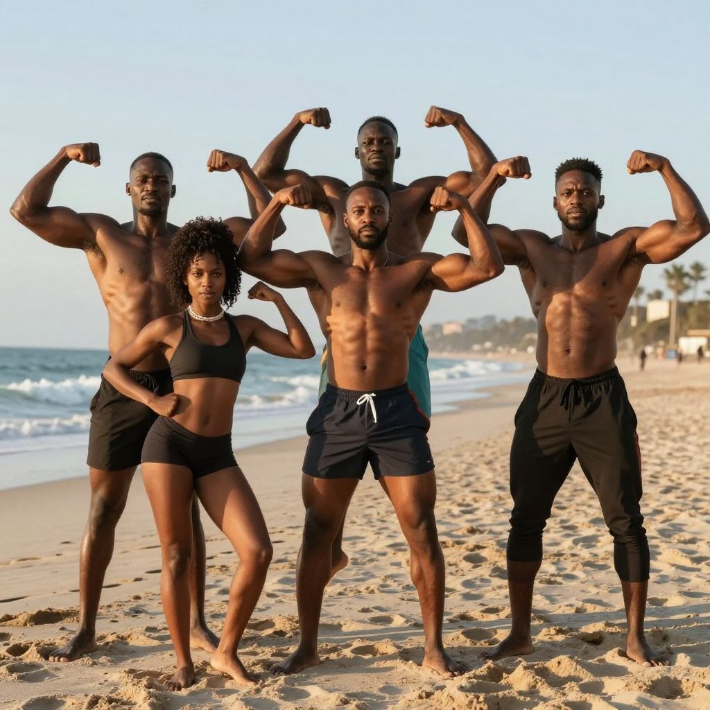 Photograph of six muscular, dark-skinned Black men on a sandy beach, flexing their biceps. They are all shirtless, wearing black or blue swim trunks. The man in the center, with short, spiked hair, stands in the foreground, prominently displaying his defined chest and abs. The background shows a clear blue sky, ocean waves, and distant beachgoers. The lighting highlights their toned physiques, creating a strong, confident atmosphere. The men's expressions are serious and focused, emphasizing their strength and unity.