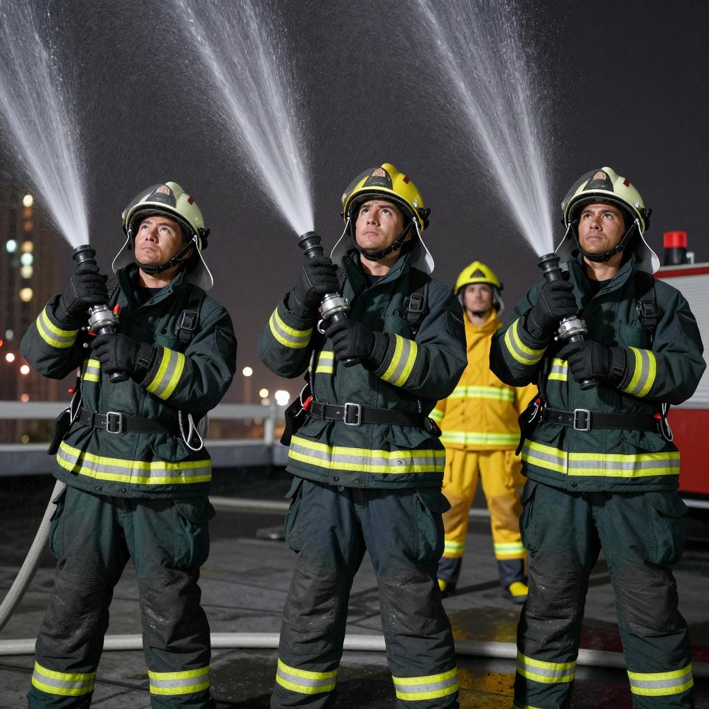 Three men in green firefighter suits with black gloves and helmets on their heads stand on a rooftop. Each holds a fire hose with water spraying. They are looking upward with intense expressions. A fourth man in a yellow fire suit is on the ground behind them. City lights fill the background. The men are positioned in a line, with the left man leaning slightly forward, the center man with arms raised, and the right man also looking upward.